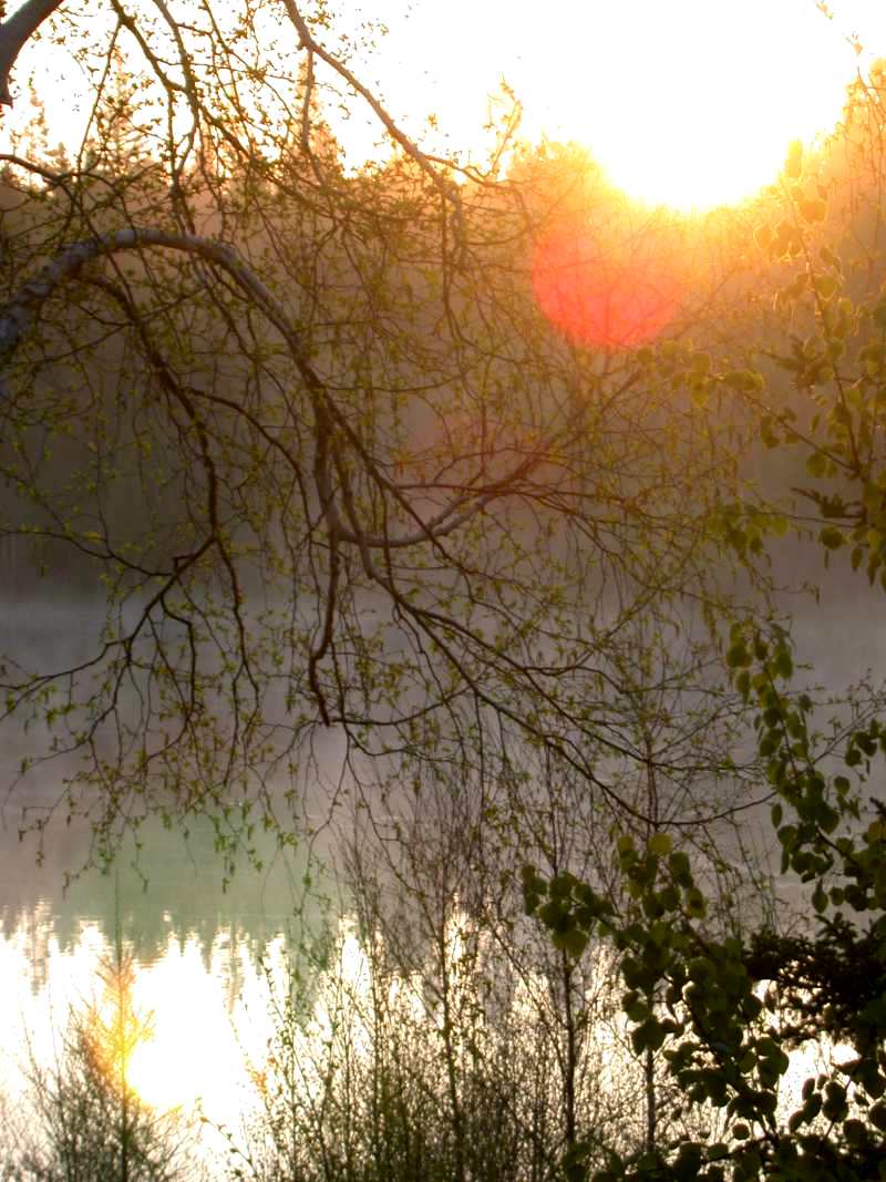 This image of the rising sun is in strong contrast to the brooding dark greens of the pond trees and their reflection in the water. It is May and the pond lilly leaves have emerged and new littoral zone plants are stretching above the water surface. |